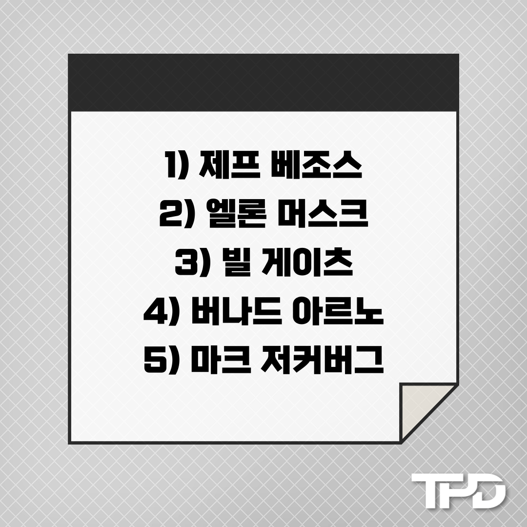 안녕하세요, 티피디입니다. 오늘은 2023년 기준 세계적인 부자 TOP10에 대해서 이야기해보려 합니다.